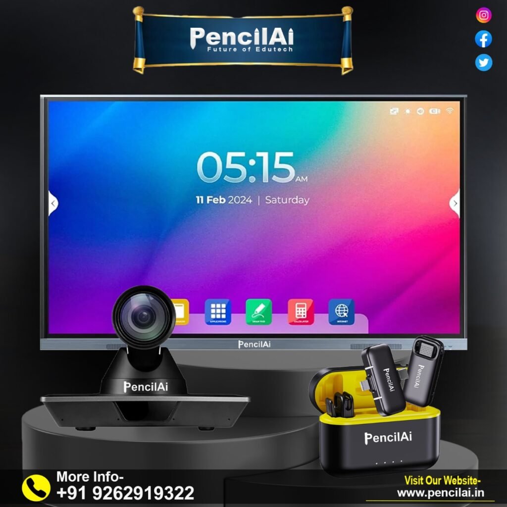 PencilAi studio setup price 2025, PencilAi digital board with mic and camera, PencilAi teaching studio, full classroom studio setup, studio lighting for teaching, PTZ camera setup for schools, PencilAi board price list, smart class setup 2025, PencilAi OPS system, online teaching studio cost India, PencilAi full package